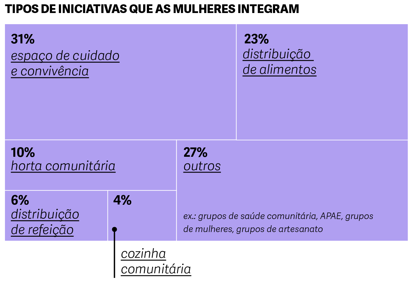 A maioria das mulheres que participam das iniciativas comunitárias contribuem com organização, dedicação de tempo e doações. As mulheres sem escolaridade ou que têm apenas ensino fundamental, de baixa renda e de áreas rurais, proporcionalmente são as principais beneficiárias das iniciativas e ao mesmo tempo em que as constroem. Isso mostra que as iniciativas conseguem não só apoiar um grupo mais vulnerável, mas também renovar as redes de cuidado.