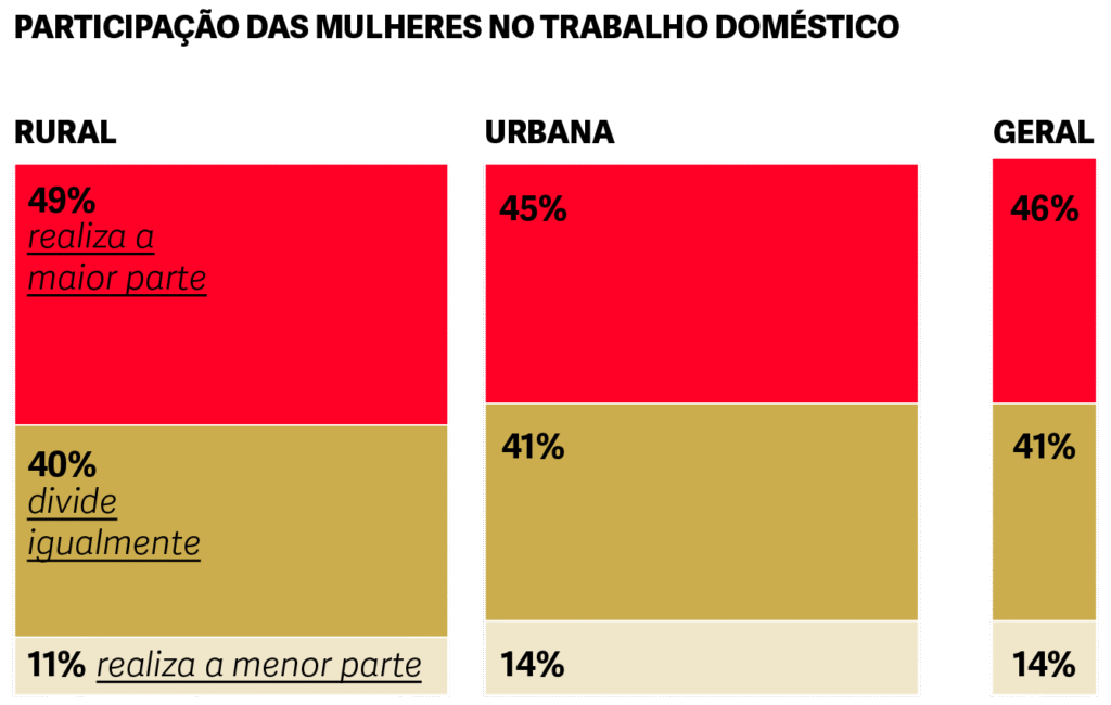 Apesar do aumento dos espaços coletivos de cuidado, a divisão do trabalho doméstico permanece desigual no âmbito privado. Mesmo quando compartilham tarefas, as mulheres ainda assumem a maior parte, o que impacta negativamente seu acesso ao mercado de trabalho, formação, saúde, lazer e qualidade de vida. Pouco mais da metade das mulheres (55%) divide essas responsabilidades e, entre as mulheres rurais, a desigualdade é ainda mais acentuada. Diante disso, discutir a coletivização desses trabalhos é fundamental para promover a autonomia e o bem-estar das mulheres.